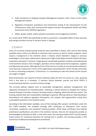 BLUE PORTS | D2.1 BLUE PORTS Baseline Report 10%u2022 Audit procedures of shipping company Management Systems, with a focus on the Safety Management System.%u2022 Regulatory framework, procedures and instruments aiming at the improvement of port infrastructure, ships, port environmental aspects and port Occupational Health and Safety Assessment Series (OHSAS) regulations.%u2022 Safety, quality, health, and/or pollution prevention and management activities.As a result, BLUE PORTS will potentially be able to overcome a noticeable deficit of blue economy and energy transition courses in the port sector in Georgia.GREECESeven (7) currently existing training initiatives were identified in Greece, with most of them being available online; others are offered as classroom short courses as well as master programs. Some require a background in the maritime sector / industry and/or Bachelor%u2019s degree or previous knowledge on main topics, whilst others require just a high school diploma (which reflects the basic, compulsory education in Greece). Target groups include both graduate students and professionals in the maritime industry, from managers, operators and on-board personnel to engineers, suppliers and laboratory personnel. %u0391lthough the focus of the courses is mostly on environmental protection, more diversity is observed in terms of the organizations providing them, which include universities as well as consulting companies. Furthermore, it is interesting to note that almost all the courses are taught in English.Most prominently, the majority of these initiatives adopt the form of courses on a fee, spanning from a few days to a semester. A common theme between courses and BLUE PORTS is environmental protection, as well as climate change. The curricula address subjects such as sustainable management, pollution management, and regulatory frameworks for decarbonization, reflecting a shared interest to navigate the industry towards the green transition, however focusing mostly in shipping, rather than the port system. The training modules deal with sustainability challenges in general, offering mainly an understanding of international and regional regulatory frameworks, risk analysis, and opportunities arising from sustainability practices in the maritime sector. According to the information available, none of the trainings offer persons%u2019 certification under the ISO 17024 standard. The available trainings offer certificates of attendance from various universities, academies, and vocational training providers. While these certificates may indicate professional qualifications and skills in the maritime industry, they do not necessarily provide an acknowledged certification of skills. In one of the cases, the training provides ECVET units (European Credit system for Vocational Education & Training) and in another, the training provides a CPD (Continuous Professional Development) eCertificate.