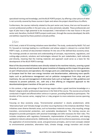 BLUE PORTS | D2.1 BLUE PORTS Baseline Report 13specialized training and knowledge, and the BLUE PORTS project, by offering a clear picture of what is not currently covered by these courses in Spain and where the project should focus its efforts.Furthermore, the courses indirectly related to the port sector and, hence, that are not focused on current professional profiles in the port area, are also extremely valuable. These professionals and type of jobs have a high potential to be incorporated / internalized in the near future in the portsector and, therefore, the BLUE PORTS project could cover, through the courses developed, the skills and abilities required by these positions and job profiles.EUAt EU level, a total of 35 training initiatives were identified. The study, conducted by ReSEL TUC and FV, focused on trainings leading to a certification and whose subject is relevant to a certain BLUE PORT%u2019s topic, as almost all documented initiatives fit into one of the defined blue economy areas. The trainings provide an overview and understanding of concepts, requirements, regulations, and cutting-edge products, solutions and technologies relevant for port stakeholders, both indirectly and directly, meaning that the training materials and approach could serve as a basis for the development of the BLUE PORTS trainings.Most of the documented initiatives were directly related to the maritime industry, covering a great diversity of courses oriented towards the green transition of shipping and the impact this generates on port infrastructures and operations; the changes ports are undertaking due to new regulations at European level for their own energy transition and decarbonization, addressing more specific topics such as performance management and air pollution management from ships and port machinery, the use and management of alternative fuels such as hydrogen or LNG, guidelines and measures to prevent pollution, etc., with only a few offering an integrated approach to the decarbonization/green transition of the port as a whole.In this context, a high percentage of the trainings require either a good maritime knowledge or a Master's degree and/or professional experience in the field of the course. The courses are primarily conducted in English and offered either online or in-person, providing flexibility to participants. The duration of the courses varies, ranging from a 1-day program to more extensive courses spanning 16 weeks.Focusing on blue economy areas, %u2018Environmental protection%u2019 is clearly predominant, while %u2018Alternative fuels%u2019 and %u2018Climate change%u2019 are other recurring themes in the initiatives identified. These initiatives cover diverse thematic areas, such as hazardous materials surveys, ship recycling, energy transition, environmental protection, and sustainable development. The training courses are designed to provide participants with practical knowledge and skills necessary for their roles. This includes compliance with regulatory frameworks, implementation of best practices, and staying updated on industry advancements. Additionally, the courses aim to enhance awareness, encourage the application of environmental, social, and governance principles, and to train concepts related to environmental protection, alternative fuels, climate change, energy transition and circular
