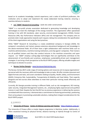 BLUE PORTS | D2.1 BLUE PORTS Baseline Report 16based on its academic knowledge, tutorial experience, and a cadre of proficient professors, the institution aims to adopt and implement the newly elaborated training material, ensuring a seamless delivery to students.%u2022 LLC %u201cG&M%u201d Research & Consulting %u2013 (web site under construction) %u201cG&M%u201d is a non-profit private association dedicated to generating knowledge and developing technologies to meet the challenges of the energy transition. The organization offers specialized training in line with ISO standards, cyber security, environmental management, OHSAS, Human Resources (HR), Key Performance Indicators (KPIs) and risk management. The company aims to promote tailor-made approaches towards each request, taking into consideration the specification of the client organizations and using the best practices. While %u201cG&M%u201d Research & Consulting is a newly established company in Georgia (2020), the company%u2019s consultants and trainers possess extensive educational background and knowledge in the above-mentioned fields. All of them have a tight collaboration with maritime fields such as maritime administrations, maritime training institutions, and ship agents%u2019 companies. Their trainers are all qualified trainers and they also conduct lectures in the maritime universities and upon request. LLC %u201cG&M%u201d employs cutting-edge technologies that can significantly contribute to the advancement of eco-friendly port practices, emphasizes sustainability-driven port management strategies. It can bring a fresh perspective to the BLUE PORTS project, offering valuable insights and techniques to elevate its success.%u2022 Bureau Veritas Georgia %u2013 www.bureauveritastraining.com The Bureau Veritas (BV)%u2019s wide range of training options and resources aim to equip organizations%u2019personnel with the necessary skills and knowledge to take on tasks. BV offer includes classroom and digital formats and tools, and covers standards relating to Quality, Health, Safety, and Environment (QHSE), Enterprise Risk, Sustainability, Transportation & Mobility and Food Safety. Their expertly designed and led courses allow attendees to meet their particular training needs effectively and efficiently.Currently, BV Georgia provides training in different fields, such as risk management, ISO training, cyber security, Integrated Management Systems, etc., employing highly experienced and qualified trainers in each field. Despite the fact that BV has no previous experience in delivering the sessions correlated with blue economy, it demonstrates a commitment to fostering partnerships, positioning them as key players in promoting sustainable solutions, making them integral considerations for the BLUE PORTS project.GREECE%u2022 University of Piraeus - Center of Lifelong Learning and Training - https://kedivim-unipi.gr/The University of Piraeus offers a master degree programme in Maritime studies. Additionally, it offers vocational training (in physical format, distance learning or hybrid) through its Centre of