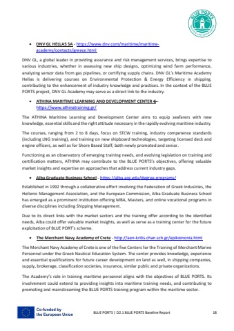 BLUE PORTS | D2.1 BLUE PORTS Baseline Report 18%u2022 DNV GL HELLAS SA - https://www.dnv.com/maritime/maritimeacademy/contacts/greece.htmlDNV GL, a global leader in providing assurance and risk management services, brings expertise to various industries, whether in assessing new ship designs, optimizing wind farm performance, analyzing sensor data from gas pipelines, or certifying supply chains. DNV GL's Maritime Academy Hellas is delivering courses on Environmental Protection & Energy Efficiency in shipping, contributing to the enhancement of industry knowledge and practices. In the context of the BLUE PORTS project, DNV GL %u0391cademy may serve as a direct link to the industry.%u2022 ATHINA MARITIME LEARNING AND DEVELOPMENT CENTER C -https://www.athinatraining.gr/The ATHINA Maritime Learning and Development Center aims to equip seafarers with new knowledge, essential skills and the right attitude necessary in the rapidly evolving maritime industry. The courses, ranging from 2 to 8 days, focus on STCW training, industry competence standards(including LNG training), and training on new shipboard technologies, targeting licensed deck and engine officers, as well as for Shore Based Staff, both newly promoted and senior.Functioning as an observatory of emerging training needs, and evolving legislation on training and certification matters, ATHINA may contribute to the BLUE PORTS%u2019s objectives, offering valuable market insights and expertise on approaches that address current industry gaps.%u2022 Alba Graduate Business School - https://alba.acg.edu/degree-programs/Established in 1992 through a collaborative effort involving the Federation of Greek Industries, the Hellenic Management Association, and the European Commission, Alba Graduate Business School has emerged as a prominent institution offering MBA, Masters, and online vocational programs in diverse disciplines including Shipping Management.Due to its direct links with the market sectors and the training offer according to the identified needs, Alba could offer valuable market insights, as well as serve as a training center for the future exploitation of BLUE PORT%u2019s scheme.%u2022 The %u039cerchant %u039davy %u0391cademy of Crete - http://aen-kritis.chan.sch.gr/epikoinonia.htmlThe %u039cerchant %u039davy %u0391cademy of Crete is one of the five Centers for the Training of Merchant Marine Personnel under the Greek Nautical Education System. The center provides knowledge, experience and essential qualifications for future career development on land as well, in shipping companies, supply, brokerage, classification societies, insurance, similar public and private organizations.The Academy%u2019s role in training maritime personnel aligns with the objectives of BLUE PORTS. Its involvement could extend to providing insights into maritime training needs, and contributing to promoting and mainstreaming the BLUE PORTS training program within the maritime sector.