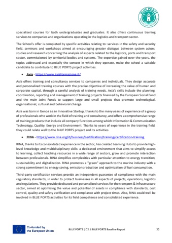 BLUE PORTS | D2.1 BLUE PORTS Baseline Report 20specialized courses for both undergraduates and graduates. It also offers continuous training services to companies and organizations operating in the logistics and transport sector. The School's offer is completed by specific activities relating to: services in the safety and security field, seminars and workshops aimed at encouraging greater dialogue between system actors,studies and research concerning the analysis of aspects related to the logistics, ports and transport sector, commissioned by territorial bodies and systems. The expertise gained over the years, the topics addressed and especially the context in which they operate, make the school a suitable candidate to contribute to BLUE PORTS project activities. %u2022 Ax%u00eda - https://www.axiaformazione.it/Ax%u00eda offers training and consultancy services to companies and individuals. They design accurate and personalized training courses with the precise objective of increasing the value of human and corporate capital, through a careful analysis of training needs. Ax%u00eda%u2019s skills include the planning, coordination, reporting and management of training projects financed by the European Social Fund and the main Joint Funds to support large and small projects that promote technological, organisational, cultural and behavioral change.Ax%u00eda was born in Genoa as an Innovative Startup, thanks to the many years of experience of a group of professionals who work in the field of training and consultancy, and offers a comprehensive range of training products that include all company functions among which Information & Communication Technology, Quality, Energy and Environment. Thanks to years of experience in the training field, they could relate well to the BLUE PORTS project and its activities.%u2022 RINA - https://www.rina.org/it/business/certification/training/certification-training RINA, thanks to its consolidated experience in the sector, has created Learning Hubs to provide highlevel knowledge and multidisciplinary skills: a dedicated environment that aims to simplify access to learning, collect teaching resources in a wide range of sectors, grow and promote interaction between professionals. RINA simplifies complexities with particular attention to energy transition, sustainability and digitalization. RINA promotes a \strong commitment to energy saving, emissions reduction and optimization of fuel consumption.Third-party certification services provide an independent guarantee of compliance with the main regulatory standards, in order to protect businesses in all aspects of projects, operations, logistics and regulations. They provide dedicated and personalized services for the transport & infrastructure sector, aimed at optimizing the value and potential of assets in compliance with standards, cost control, quality and safety verification and compliance with project times. Also, RINA could well be involved in BLUE PORTS activities for its field competence and consolidated experience.