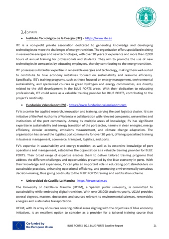 BLUE PORTS | D2.1 BLUE PORTS Baseline Report 21SPAIN%u2022 Instituto Tecnol%u00f3gico de la Energ%u00eda (ITE) - https://www.ite.es ITE is a non-profit private association dedicated to generating knowledge and developing technologies to meet the challenges of energy transition. The organization offers specialized training in renewable energies and new technologies, with over 30 years of experience and more than 2,000 hours of annual training for professionals and students. They aim to promote the use of new technologies in companies by educating employees, thereby contributing to the energy transition. ITE possesses substantial expertise in renewable energies and technology, making them well-suited to contribute to blue economy initiatives focused on sustainability and resource efficiency. Specifically, ITE's training programs, such as those focused on energy management, environmental sustainability, and specialized courses in green hydrogen and energy communities, are directly related to the skill development in the BLUE PORTS areas. With their dedication to educating professionals, ITE could serve as a valuable training provider for BLUE PORTS, contributing to the project%u2019s continuity.%u2022 Fundaci%u00f3n Valenciaport (FV) - https://www.fundacion.valenciaport.comFV is a center for applied research, innovation and training, serving the port logistics cluster. It is an initiative of the Port Authority of Valencia in collaboration with relevant companies, universities and institutions of the port community. Among its multiple areas of knowledge, FV has significant expertise in sustainability and energy transition of the port sector, namely in clean energies, energy efficiency, circular economy, emissions measurement, and climate change adaptation. The organization has served the logistics port community for over 30 years, offering specialized training in business management, commerce, transport, logistics, and ports.FV%u2019s expertise in sustainability and energy transition, as well as its extensive knowledge of port operations and management, establishes the organization as a valuable training provider for BLUE PORTS. Their broad range of expertise enables them to deliver tailored training programs that address the different challenges and opportunities presented by the blue economy in ports. With their knowledge and experience, FV can play an important role in educating port stakeholders on sustainable practices, enhancing operational efficiency, and promoting environmentally conscious decision-making, thus giving continuity to the BLUE PORTS training and certification scheme.%u2022 Universidad de Castilla-La Mancha - https://www.uclm.esThe University of Castilla-La Mancha (UCLM), a Spanish public university, is committed to sustainability while embracing digital transition. With over 25.000 students yearly, UCLM provides several degrees, masters, doctorates and courses relevant to environmental sciences, renewables energies and sustainable transportation.UCLM, with its array of courses covering critical areas aligning with the objectives of blue economyinitiatives, is an excellent option to consider as a provider for a tailored training course that