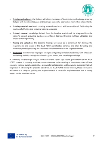 BLUE PORTS | D2.1 BLUE PORTS Baseline Report 27%u2022 Training methodology: the findings will inform the design of the training methodology, ensuring it aligns with the identified gaps and leverages successful approaches from other related fields.%u2022 Training materials and tools: existing materials and tools will be considered, facilitating the creation of effective and engaging training resources.%u2022 Trainer%u2019s manual: knowledge derived from the baseline analysis will be integrated into the trainer%u2019s manual, providing guidance on efficient tool and training methods utilization and effective training delivery.%u2022 Testing and validation: the baseline findings will serve as a benchmark for defining the requirements and scope of the BLUE PORTS certification scheme, and later its testing and validation process (ensuring the relevance and effectiveness in the targeted context).%u2022 Promotion: the identified EU project synergies will guide promotional activities, with a focus on maximizing visibility through social media, joint events, and knowledge exchange.In summary, the thorough analysis conducted in this report lays a solid groundwork for the BLUE PORTS project. It not only provides a comprehensive understanding of the current state of blue economy training but also establishes avenues for collaboration and knowledge exchange that will be pivotal in advancing the project's objectives. As BLUE PORTS moves forward, these conclusions will serve as a compass, guiding the project towards a successful implementation and a lasting impact on the maritime sector.