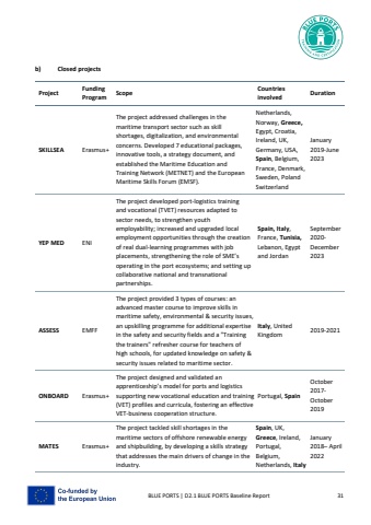 BLUE PORTS | D2.1 BLUE PORTS Baseline Report 31b) Closed projectsProject Funding Program ScopeCountries involved DurationSKILLSEA Erasmus+The project addressed challenges in themaritime transport sector such as skillshortages, digitalization, and environmental concerns. Developed 7 educational packages,innovative tools, a strategy document, andestablished the Maritime Education andTraining Network (METNET) and the EuropeanMaritime Skills Forum (EMSF).Netherlands, Norway, Greece,Egypt, Croatia, Ireland, UK, Germany, USA,Spain, Belgium, France, Denmark, Sweden, Poland SwitzerlandJanuary 2019-June 2023YEP MED ENIThe project developed port-logistics training and vocational (TVET) resources adapted to sector needs, to strengthen youth employability; increased and upgraded local employment opportunities through the creation of real dual-learning programmes with job placements, strengthening the role of SME%u2019s operating in the port ecosystems; and setting up collaborative national and transnational partnerships.Spain, Italy, France, Tunisia, Lebanon, Egypt and JordanSeptember 2020-December 2023ASSESS EMFFThe project provided 3 types of courses: an advanced master course to improve skills in maritime safety, environmental & security issues, an upskilling programme for additional expertise in the safety and security fields and a \the trainers\high schools, for updated knowledge on safety &security issues related to maritime sector.Italy, United Kingdom 2019-2021ONBOARD Erasmus+The project designed and validated an apprenticeship%u2019s model for ports and logistics supporting new vocational education and training (VET) profiles and curricula, fostering an effective VET-business cooperation structure.Portugal, SpainOctober 2017-October 2019MATES Erasmus+The project tackled skill shortages in the maritime sectors of offshore renewable energy and shipbuilding, by developing a skills strategy that addresses the main drivers of change in the industry. Spain, UK, Greece, Ireland, Portugal, Belgium, Netherlands, ItalyJanuary 2018%u2013 April 2022