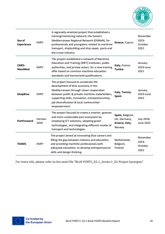 BLUE PORTS | D2.1 BLUE PORTS Baseline Report 32Sea of ExperienceEMFFA regionally-oriented project that established a training/mentoring network; the Eastern Mediterranean Regional Network (EMReN), for professionals and youngsters related to maritime transport, shipbuilding and ship repair, ports and the cruise industry. Greece, Cyprus November 2019-October 2022CMESWestMed EMFFThe project established a network of Maritime Education and Training (MET) Institutes, public authorities, and private actors, for a new training offer based on common maritime education standards and harmonized qualifications. Italy, France, TunisiaJanuary 2019-June 2021DeepBlue EMFFThe project focused to accelerate the development of blue economy in the Mediterranean through closer cooperation between public & private maritime stakeholders, supporting skills, innovation, entrepreneurship,job diversification & local communities' empowerment.Italy, Tunisia, SpainJanuary 2019-June 2022PortForward Horizon 2020The project focused to create a smarter, greener, and more sustainable port ecosystem by employing ICT solutions, adopting green technologies, and integrating different modes of transport and technologies.Spain, Belgium, UK, Germany, Greece, Italy,NorwayJuly 2018-June 2022TEAMS EMFFThe project aimed at innovating blue careers andfilling the gap between industry and education, and providing maritime professionals with adequate education, to develop entrepreneurial skills and design thinking.Netherlands, Belgium, FinlandNovember 2019-October 2022For more info, please refer to the excel file %u201cBLUE PORTS_D2.1_Annex II_EU Project Synergies%u201d.