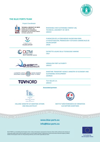 BLUE PORTS is co-Funded by the European Union. Views and opinions expressed are however those of the author(s) only and do not necessarily reflect those of the European Union or the European Climate, Infrastructure and Environment Executive Agency (CINEA). Neither the European Union nor the granting authority can be held responsible for them.www.blue-ports.euinfo@blue-ports.euTHE BLUE PORTS TEAM Project CoordinatorRENEWABLE AND SUSTAINABLE ENERGY LAB,TECHNICAL UNIVERSITY OF CRETEGREECEFUNDACION DE LA COMUNIDAD VALENCIANA PARALA INVESTIGACION, PROMOCION Y ESTUDIOS COMERCIALES DE VALENCIAPORTSPAINDISTRETTO LIGURE DELLE TECNOLOGIE MARINEITALYHERAKLION PORT AUTHORITYGREECEMARITIME TRANSPORT AGENCY, MINISTRY OF ECONOMY AND SUSTAINABLE DEVELOPMENTGEORGIATUV HELLAS S.A.GREECEAssociated partnersHELLENIC MINISTRY OF MARITIME AFFAIRSAND INSULAR POLICYINSTITUT M%u00c9DITERRAN%u00c9EN DE FORMATIONAUX M%u00c9TIERS MARITIMES