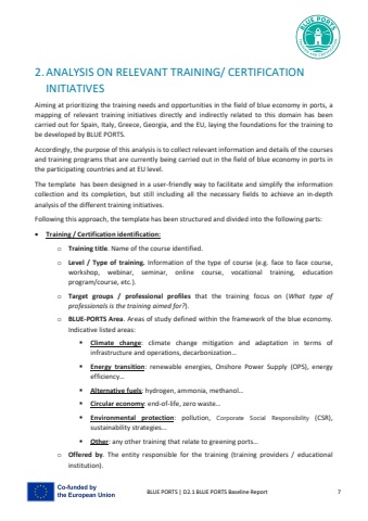 BLUE PORTS | D2.1 BLUE PORTS Baseline Report 72.ANALYSIS ON RELEVANT TRAINING/ CERTIFICATION INITIATIVESAiming at prioritizing the training needs and opportunities in the field of blue economy in ports, a mapping of relevant training initiatives directly and indirectly related to this domain has been carried out for Spain, Italy, Greece, Georgia, and the EU, laying the foundations for the training to be developed by BLUE PORTS.Accordingly, the purpose of this analysis is to collect relevant information and details of the courses and training programs that are currently being carried out in the field of blue economy in ports inthe participating countries and at EU level. The template has been designed in a user-friendly way to facilitate and simplify the information collection and its completion, but still including all the necessary fields to achieve an in-depth analysis of the different training initiatives.Following this approach, the template has been structured and divided into the following parts:%u2022 Training / Certification identification:o Training title. Name of the course identified.o Level / Type of training. Information of the type of course (e.g. face to face course, workshop, webinar, seminar, online course, vocational training, education program/course, etc.).o Target groups / professional profiles that the training focus on (What type of professionals is the training aimed for?).o BLUE-PORTS Area. Areas of study defined within the framework of the blue economy. %u0399ndicative listed areas:%uf0a7 Climate change: climate change mitigation and adaptation in terms of infrastructure and operations, decarbonization%u2026%uf0a7 Energy transition: renewable energies, Onshore Power Supply (OPS), energy efficiency%u2026%uf0a7 Alternative fuels: hydrogen, ammonia, methanol%u2026%uf0a7 Circular economy: end-of-life, zero waste%u2026%uf0a7 Environmental protection: pollution, Corporate Social Responsibility (CSR), sustainability strategies...%uf0a7 Other: any other training that relate to greening ports%u2026o Offered by. The entity responsible for the training (training providers / educational institution).