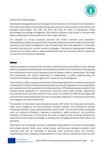 BLUE PORTS | D2.5 Identification of present and future skills needs 101assessment methodologies.Sustainable energy generation and management will become a cornerstone of port operations. Ports will invest heavily in renewable energy sources such as solar panels, wind turbines, and hydrogen technologies. This shift will drive the need for skills in sustainable energy technologies and energy management. Educational programs must evolve to include these topics, preparing the future workforce for the energy transition.The adoption of circular economy practices will further transform port operations. Emphasizing recycling, reusing, and reducing waste, these practices will impact procurement, operations, and waste management roles. Professionals will need expertise in sustainable business practices and circular economy strategies. Training and development initiatives should focus on these areas to equip professionals with the necessary skills to implement circular economy initiatives effectively.Greece Advances related to the port Green Transition and Blue Economy by 2030 are set to reshape both the operational landscape and the professional profiles within Greek ports. Recognizing the multifaceted nature of port operations and the diverse needs of stakeholders, the Greek NTC emphasized the critical importance of establishing a unified understanding and commitment towards achieving \Cold ironing, or OPS, emerges as the forefront technology expected to be widely implemented in Greek ports by 2030. This advancement is driven by recent EU regulations mandating cleaner port operations and the availability of funding incentives. OPS enables vessels to switch from onboard diesel generators to shore-based electrical power while docked, significantly reducing emissions and noise pollution in port areas. The adoption of OPS not only aligns with environmental sustainability goals but also necessitates expertise in electrical infrastructure and integration for port professionals.The adoption of alternative fuels represents a pivotal shift within the Greek port community. Major ports, integral to the trans-European transport network, are mandated to provide refuelling facilities for ships using alternative fuels by 2030. This transition poses challenges such as technical limitations, regulatory compliance, safety protocols, and workforce readiness. Professionals in Greek ports will need to adapt to new refuelling infrastructure requirements and acquire knowledge in handling and managing alternative fuels safely and efficiently.Greek ports are increasingly turning to renewable energy systems to enhance sustainability and energy security. Wind, solar, ocean energy, and biomass represent abundant local resources that can be harnessed to generate clean electricity within port facilities. Implementing these renewable energy systems not only reduces operational costs but also