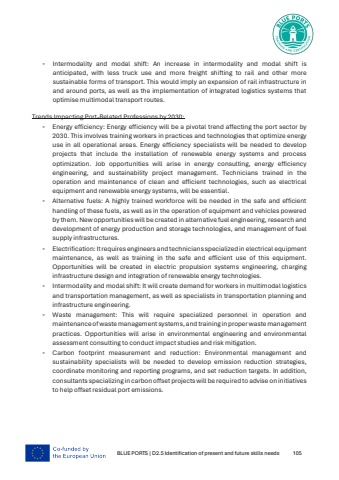 BLUE PORTS | D2.5 Identification of present and future skills needs 105%uf0a7 Intermodality and modal shift: An increase in intermodality and modal shift is anticipated, with less truck use and more freight shifting to rail and other more sustainable forms of transport. This would imply an expansion of rail infrastructure in and around ports, as well as the implementation of integrated logistics systems that optimise multimodal transport routes. Trends Impacting Port-Related Professions by 2030:%uf0a7 Energy efficiency: Energy efficiency will be a pivotal trend affecting the port sector by 2030. This involves training workers in practices and technologies that optimize energy use in all operational areas. Energy efficiency specialists will be needed to develop projects that include the installation of renewable energy systems and process optimization. Job opportunities will arise in energy consulting, energy efficiency engineering, and sustainability project management. Technicians trained in the operation and maintenance of clean and efficient technologies, such as electrical equipment and renewable energy systems, will be essential. %uf0a7 Alternative fuels: A highly trained workforce will be needed in the safe and efficient handling of these fuels, as well as in the operation of equipment and vehicles powered by them. New opportunities will be created in alternative fuel engineering, research and development of energy production and storage technologies, and management of fuel supply infrastructures. %uf0a7 Electrification: It requires engineers and technicians specialized in electrical equipment maintenance, as well as training in the safe and efficient use of this equipment. Opportunities will be created in electric propulsion systems engineering, charging infrastructure design and integration of renewable energy technologies. %uf0a7 Intermodality and modal shift: It will create demand for workers in multimodal logistics and transportation management, as well as specialists in transportation planning and infrastructure engineering. %uf0a7 Waste management: This will require specialized personnel in operation and maintenance of waste management systems, and training in proper waste management practices. Opportunities will arise in environmental engineering and environmental assessment consulting to conduct impact studies and risk mitigation. %uf0a7 Carbon footprint measurement and reduction: Environmental management and sustainability specialists will be needed to develop emission reduction strategies, coordinate monitoring and reporting programs, and set reduction targets. In addition, consultants specializing in carbon offset projects will be required to advise on initiatives to help offset residual port emissions.