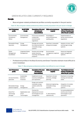 BLUE PORTS | D2.5 Identification of present and future skills needs 106GREEN RELATED-JOBS CURRENTLY REQUIREDGeorgia %uf0a7 Blue and green related professional profiles currently requested in the port sector:Table 16. Blue and green related professional profiles currently requested in the port sector in GeorgiaJob / Professional profile BLUE PORTS Area(s) Description of the role / job (tasks and responsibilities) Skills and competences required Port initiatives in terms of Green Transition that affect the job / position Environmental Compliance Officer Environmental Management Ensure port operations comply with environmental regulations Knowledge of environmental laws, auditing skills Implementation of stricter environmental regulations Renewable Energy Specialist Energy Management Manage and oversee the implementation of renewable energy systems Expertise in renewable energy technologies Adoption of solar, wind, and hydrogen energy systems Waste Management Coordinator Integrated Waste Management Develop and manage waste reduction, recycling, and disposal programs Environmental management, logistical skills Advanced integrated waste management systems %uf0a7 Professional profiles in the Blue Economy and Green Transition domain most difficult to cover nowadays:Table 17. Blue and green professional profiles most difficult to cover in GeorgiaJob / Professional profile BLUE PORTS Area(s) Description of the role / job (tasks and responsibilities) Skills and competences required Port initiatives in terms of Green Transition that affect the job / position Circular Economy SpecialistSustainable Business PracticesImplement circular economy strategies in port operationsExpertise in circular economy, strategic planningEmphasis on recycling, reusing, and reducing wasteRenewable Energy Systems EngineerEnergy ManagementDesign and maintain renewable energy systems within the portAdvanced engineering, renewable energy expertiseIntegration of complex renewable energy systemsSmart Port Technology ManagerDigitalization and Smart TechnologiesOversee the deployment of smart technologies for port managementIT, data analytics, cybersecurityIncreasing digitalization and the use of smart technologies in port operations