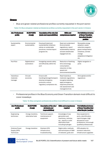 BLUE PORTS | D2.5 Identification of present and future skills needs 107Greece %uf0a7 Blue and green related professional profiles currently requested in the port sector:Table 18. Blue and green related professional profiles currently requested in the port sector in GreeceJob / Professional profile BLUE PORTS Area(s) Description of the role / job (tasks and responsibilities) Skills and competences required Port initiatives in terms of Green Transition that affect the job / position Sustainability expertEnvironmental sustainability Develop/implement sustainability initiatives; advise on sustainable practices; monitor/report progress etc.Read and understand Environmental regulations; report sustainability metrics; activate stakeholder engagement etc.Renewable energy adoption; waste reduction program; green transportation initiatives; climate change adaptation/mitigation etc.Port Pilot Digitalization/ automationNavigating vessels safely and efficiently within the portReduction of berthing time and energy consumption; reduction of ship speed and environmental benefits Digital navigation in portsHazardous materials managerCircular economyEnsure safe handling/storage/transport; develop emergency protocols; ensure regulatory compliance etc.Read hazardous materials regulations; recognize labelling; apply emergency response protocols; risk assessment and management etc.Strict global and EU regulations%uf0a7 Professional profiles in the Blue Economy and Green Transition domain most difficult to cover nowadays:Table 19. Blue and green professional profiles most difficult to cover in GreeceJob / Professional profile BLUE PORTS Area(s) Description of the role / job (tasks and responsibilities) Skills and competences required Port initiatives in terms of Green Transition that affect the job / position Engineering technicianEnergy transition, alternative fuelsTechnical support; maintenance of equipmentKnowledge of new generation port machinery, vehicles, etc., electric or with alternative fuels including hydrogenNew equipment in ports, electrification, rapid changes; High demand for such professions, not enough qualified professionalsOnshore Power Supply (OPS) TechnicianEnergy transition Maintain OPS infrastructure, troubleshootingDigital skills; methods and techniques of O&M of networks, grids and OPS adoption for emission reduction, infrastructure upgrades