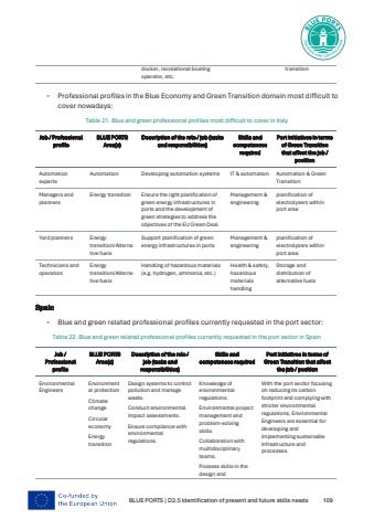 BLUE PORTS | D2.5 Identification of present and future skills needs 109docker, recreational boating operator, etc.transition%uf0a7 Professional profiles in the Blue Economy and Green Transition domain most difficult to cover nowadays:Table 21. Blue and green professional profiles most difficult to cover in ItalyJob / Professional profile BLUE PORTS Area(s) Description of the role / job (tasks and responsibilities) Skills and competences required Port initiatives in terms of Green Transition that affect the job / position Automation expertsAutomation Developing automation systems IT & automation Automation & Green TransitionManagers and plannersEnergy transition Ensure the right planification of green energy infrastructures in ports and the development of green strategies to address the objectives of the EU Green DealManagement & engineeringplanification of electrolysers within port areaYard planners Energy transition/Alternative fuelsSupport planification of green energy infrastructures in portsManagement & engineeringplanification of electrolysers within port areaTechnicians and operatorsEnergy transition/Alternative fuelsHandling of hazardous materials (e.g. hydrogen, ammonia, etc.)Health & safety, hazardous materials handlingStorage and distribution of alternative fuelsSpain %uf0a7 Blue and green related professional profiles currently requested in the port sector:Table 22. Blue and green related professional profiles currently requested in the port sector in SpainJob / Professional profile BLUE PORTS Area(s) Description of the role / job (tasks and responsibilities) Skills and competences required Port initiatives in terms of Green Transition that affect the job / position Environmental EngineersEnvironmental protectionClimate changeCircular economyEnergy transitionDesign systems to control pollution and manage waste.Conduct environmental impact assessments.Ensure compliance with environmental regulations.Knowledge of environmental regulations.Environmental project management and problem-solving skills.Collaboration with multidisciplinary teams.Possess skills in the design and With the port sector focusing on reducing its carbon footprint and complying with stricter environmental regulations, Environmental Engineers are essential for developing and implementing sustainable infrastructure and processes.