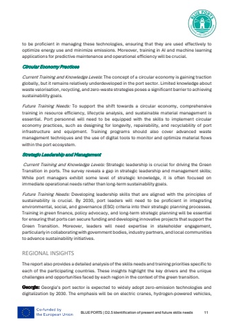 BLUE PORTS | D2.5 Identification of present and future skills needs 11to be proficient in managing these technologies, ensuring that they are used effectively to optimize energy use and minimize emissions. Moreover, training in AI and machine learning applications for predictive maintenance and operational efficiency will be crucial.Circular Economy Practices Current Training and Knowledge Levels: The concept of a circular economy is gaining traction globally, but it remains relatively underdeveloped in the port sector. Limited knowledge about waste valorisation, recycling, and zero-waste strategies poses a significant barrier to achieving sustainability goals.Future Training Needs: To support the shift towards a circular economy, comprehensive training in resource efficiency, lifecycle analysis, and sustainable material management is essential. Port personnel will need to be equipped with the skills to implement circular economy practices, such as designing for longevity, repairability, and recyclability of port infrastructure and equipment. Training programs should also cover advanced waste management techniques and the use of digital tools to monitor and optimize material flows within the port ecosystem.Strategic Leadership and Management Current Training and Knowledge Levels: Strategic leadership is crucial for driving the Green Transition in ports. The survey reveals a gap in strategic leadership and management skills;While port managers exhibit some level of strategic knowledge, it is often focused on immediate operational needs rather than long-term sustainability goals.Future Training Needs: Developing leadership skills that are aligned with the principles of sustainability is crucial. By 2030, port leaders will need to be proficient in integrating environmental, social, and governance (ESG) criteria into their strategic planning processes. Training in green finance, policy advocacy, and long-term strategic planning will be essential for ensuring that ports can secure funding and developing innovative projects that support the Green Transition. Moreover, leaders will need expertise in stakeholder engagement, particularly in collaborating with government bodies, industry partners, and local communities to advance sustainability initiatives.REGIONAL INSIGHTSThe report also provides a detailed analysis of the skills needs and training priorities specific to each of the participating countries. These insights highlight the key drivers and the unique challenges and opportunities faced by each region in the context of the green transition.Georgia: Georgia%u2019s port sector is expected to widely adopt zero-emission technologies and digitalization by 2030. The emphasis will be on electric cranes, hydrogen-powered vehicles,