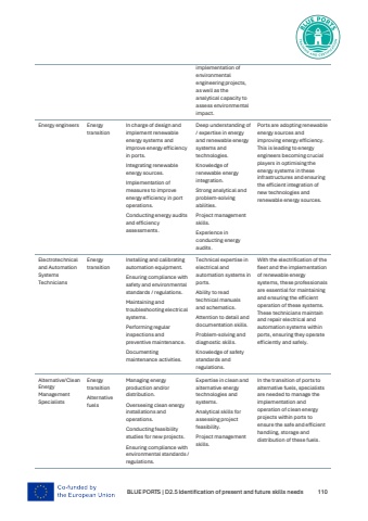 BLUE PORTS | D2.5 Identification of present and future skills needs 110implementation of environmental engineering projects, as well as the analytical capacity to assess environmental impact.Energy engineers Energy transitionIn charge of design and implement renewable energy systems and improve energy efficiency in ports.Integrating renewable energy sources.Implementation of measures to improve energy efficiency in port operations.Conducting energy audits and efficiency assessments.Deep understanding of / expertise in energy and renewable energy systems and technologies.Knowledge of renewable energy integration.Strong analytical and problem-solving abilities.Project management skills.Experience in conducting energy audits.Ports are adopting renewable energy sources and improving energy efficiency. This is leading to energy engineers becoming crucial players in optimising the energy systems in these infrastructures and ensuring the efficient integration of new technologies and renewable energy sources.Electrotechnical and Automation Systems TechniciansEnergy transitionInstalling and calibrating automation equipment.Ensuring compliance with safety and environmental standards / regulations.Maintaining and troubleshooting electrical systems.Performing regular inspections and preventive maintenance.Documenting maintenance activities.Technical expertise in electrical and automation systems in ports.Ability to read technical manuals and schematics.Attention to detail and documentation skills.Problem-solving and diagnostic skills.Knowledge of safety standards and regulations.With the electrification of the fleet and the implementation of renewable energy systems, these professionals are essential for maintaining and ensuring the efficient operation of these systems. These technicians maintain and repair electrical and automation systems within ports, ensuring they operate efficiently and safely.Alternative/Clean Energy Management SpecialistsEnergy transitionAlternative fuelsManaging energy production and/or distribution.Overseeing clean energy installations and operations.Conducting feasibility studies for new projects.Ensuring compliance with environmental standards / regulations.Expertise in clean and alternative energy technologies and systems.Analytical skills for assessing project feasibility.Project management skills.In the transition of ports to alternative fuels, specialists are needed to manage the implementation and operation of clean energy projects within ports to ensure the safe and efficient handling, storage and distribution of these fuels.