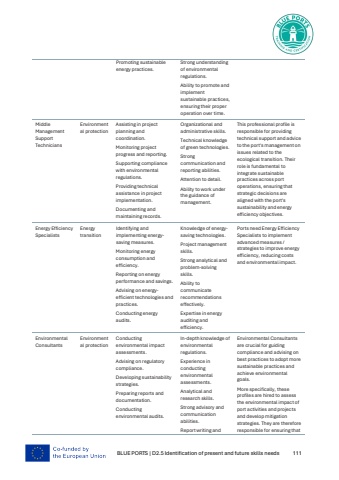 BLUE PORTS | D2.5 Identification of present and future skills needs 111Promoting sustainable energy practices.Strong understanding of environmental regulations.Ability to promote and implement sustainable practices, ensuring their proper operation over time.Middle Management Support TechniciansEnvironmental protectionAssisting in project planning and coordination.Monitoring project progress and reporting.Supporting compliance with environmental regulations.Providing technical assistance in project implementation.Documenting and maintaining records.Organizational and administrative skills.Technical knowledge of green technologies.Strong communication and reporting abilities.Attention to detail.Ability to work under the guidance of management.This professional profile is responsible for providing technical support and advice to the port's management on issues related to the ecological transition. Their role is fundamental to integrate sustainable practices across port operations, ensuring that strategic decisions are aligned with the port's sustainability and energy efficiency objectives.Energy Efficiency SpecialistsEnergy transitionIdentifying and implementing energysaving measures.Monitoring energy consumption and efficiency.Reporting on energy performance and savings.Advising on energyefficient technologies and practices.Conducting energy audits.Knowledge of energysaving technologies.Project management skills.Strong analytical and problem-solving skills.Ability to communicate recommendations effectively.Expertise in energy auditing and efficiency.Ports need Energy Efficiency Specialists to implement advanced measures / strategies to improve energy efficiency, reducing costs and environmental impact.Environmental ConsultantsEnvironmental protectionConducting environmental impact assessments.Advising on regulatory compliance.Developing sustainability strategies.Preparing reports and documentation.Conducting environmental audits.In-depth knowledge of environmental regulations.Experience in conducting environmental assessments.Analytical and research skills.Strong advisory and communication abilities.Report writing and Environmental Consultants are crucial for guiding compliance and advising on best practices to adopt more sustainable practices and achieve environmental goals.More specifically, these profiles are hired to assess the environmental impact of port activities and projects and develop mitigation strategies. They are therefore responsible for ensuring that