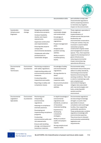 BLUE PORTS | D2.5 Identification of present and future skills needs 112documentation skills. port activities comply with environmental regulations and for proposing solutions to minimise any negative impact on the environment.Sustainable Infrastructure EngineersClimate changeDesigning sustainable infrastructure projects.Conduct feasibility studies and impact assessments.Supervise construction and implementation.Ensuring that projects comply with environmental standards.Collaborate with other professionals on sustainable designs.Expertise in sustainable design and construction.Knowledge of environmental regulations.Project management skills.Analytical and problem-solving abilities.Ability to work in multidisciplinary teams.These engineers specialise in the design and implementation of infrastructures that promote biodiversity and environmental conservation. In the port context, they are involved in coastal habitat restoration projects, construction of green areas and management of natural spaces. Thus, their expertise supports the development of green infrastructure, reducing environmental impact and enhancing operational efficiency.Environmental Safety TechniciansEnvironmental protectionMonitoring compliance with safety regulations.Implementing safety and environmental protection measures.Conducting safety inspections and audits.Reporting on safety and compliance issues.Knowledge of safety and environmental regulations.Strong attention to detail.Analytical and inspection skills.Good communication and reporting abilities.Environmental safety technicians ensure that ports adhere to safety standards, minimizing environmental hazards and ensuring safe working conditions. Their role is vital for maintaining a safe and compliant port environment helping to mitigate risks associated with new technologies and fuels, protecting both workers and the environment.Environmental Legislation SpecialistsEnvironmental protectionMonitoring and interpreting environmental regulations.Advising on compliance and best practices.Developing and implementing compliance programs.Conducting environmental audits and risk assessments.Ensure safe handling, storage, and disposal of hazardous materials.In-depth knowledge of environmental regulations and standards, as well as of hazardous materials handling.Experience in developing compliance strategies.Ability to conduct audits and prepare reports.Strong analytical and research skills.Environmental regulations are becoming increasingly stringent, so ports need specialists to ensure compliance and avoid legal hurdles, thus supporting sustainable operations. These professionals combine regulatory knowledge with environmental expertise. They know how to interpret environmental sustainability legislation and requirements.