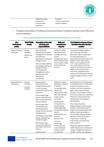 BLUE PORTS | D2.5 Identification of present and future skills needs 113Implement safety protocols for environmental protection.Excellent communication and advisory abilities.%uf0a7 Professional profiles in the Blue Economy and Green Transition domain most difficult to cover nowadays:Table 23. Blue and green professional profiles most difficult to cover in SpainJob / Professional profile BLUE PORTS Area(s) Description of the role / job (tasks and responsibilities) Skills and competences required Port initiatives in terms of Green Transition that affect the job / position Energy Transition SpecialistsEnergy transitionAlternative fuelsThey handle thestrategic planning and management of projects that shift port operations to renewable energy sources. They are responsible for the strategic aspects of energy transition, including project management, policy development, and stakeholder coordination.Energy Transition Specialists need strategic planning, project management, and a deep understanding of renewable energy technologies and policiesIndividuals holding positions such as Energy Transition Specialists will be responsible for defining the types of alternative fuels to be used in the logistics chain, determining which can be supplied at the port, assessing the electrical capacity required for the port to supply ships and other port machinery, establishing the policies to be followed in ports to support energy transition, and so forth.Energy Efficiency TechniciansEnergy transitionClimate changeResponsible for implementing and maintaining measures to reduce energy consumption within port operations.Conducting energy audits to identify areas where energy efficiency can be improved.Performing routine maintenance and troubleshooting of energy-efficient systems and equipment.Installing and calibrating energy-saving devices and technologies.Monitoring energy consumption data and reporting on efficiency metrics.Assisting in the Attention to detail: Meticulous attention to detail in conducting audits, performing maintenance tasks, and implementing energy-saving measures.Data Analysis: Competence in monitoring and analysing energy consumption data to identify inefficiencies and areas for improvement.Technical Knowledge: Comprehensive understanding of energy systems, conservation Electrification of Port Equipment and Infrastructure: The transition to electric-powered cranes, vehicles, and other equipment within ports requires Energy Efficiency Technicians to ensure that these systems are operating efficiently and to maintain the infrastructure that supports electrification.Shore Power Systems: Implementation of shore power systems, which allow ships to plug into the electrical grid while docked, reducing emissions from auxiliary engines. Energy Efficiency Technicians play a critical role in installing, maintaining, and optimizing these systems.Energy Management Systems (EMS): Deployment of advanced energy management systems to monitor, control, and optimize