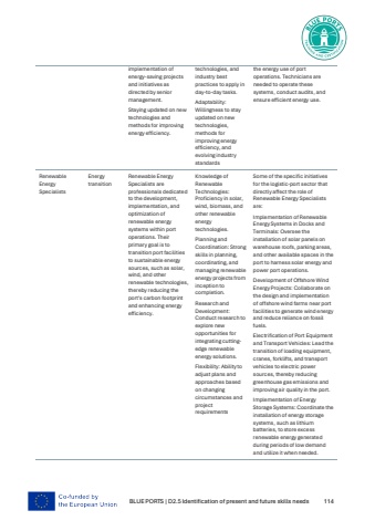 BLUE PORTS | D2.5 Identification of present and future skills needs 114implementation of energy-saving projects and initiatives as directed by senior management.Staying updated on new technologies and methods for improving energy efficiency.technologies, and industry best practices to apply in day-to-day tasks.Adaptability: Willingness to stay updated on new technologies, methods for improving energy efficiency, and evolving industry standardsthe energy use of port operations. Technicians are needed to operate these systems, conduct audits, and ensure efficient energy use.Renewable Energy SpecialistsEnergy transitionRenewable Energy Specialists are professionals dedicated to the development, implementation, and optimization of renewable energy systems within port operations. Their primary goal is to transition port facilities to sustainable energy sources, such as solar, wind, and other renewable technologies, thereby reducing the port's carbon footprint and enhancing energy efficiency.Knowledge of Renewable Technologies: Proficiency in solar, wind, biomass, and other renewable energy technologies.Planning and Coordination: Strong skills in planning, coordinating, and managing renewable energy projects from inception to completion.Research and Development: Conduct research to explore new opportunities for integrating cuttingedge renewable energy solutions.Flexibility: Ability to adjust plans and approaches based on changing circumstances and project requirementsSome of the specific initiatives for the logistic-port sector that directly affect the role of Renewable Energy Specialists are: Implementation of Renewable Energy Systems in Docks and Terminals: Oversee the installation of solar panels on warehouse roofs, parking areas, and other available spaces in the port to harness solar energy and power port operations.Development of Offshore Wind Energy Projects: Collaborate on the design and implementation of offshore wind farms near port facilities to generate wind energy and reduce reliance on fossil fuels.Electrification of Port Equipment and Transport Vehicles: Lead the transition of loading equipment, cranes, forklifts, and transport vehicles to electric power sources, thereby reducing greenhouse gas emissions and improving air quality in the port.Implementation of Energy Storage Systems: Coordinate the installation of energy storage systems, such as lithium batteries, to store excess renewable energy generated during periods of low demand and utilize it when needed.