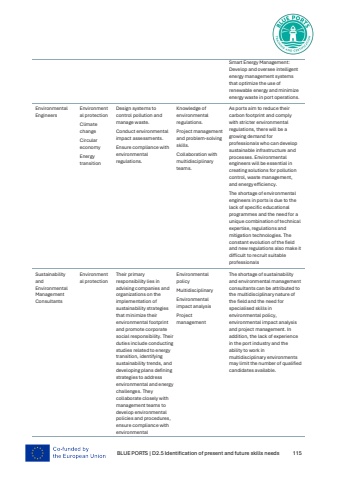 BLUE PORTS | D2.5 Identification of present and future skills needs 115Smart Energy Management: Develop and oversee intelligent energy management systems that optimize the use of renewable energy and minimize energy waste in port operations.Environmental EngineersEnvironmental protectionClimate changeCircular economyEnergy transitionDesign systems to control pollution and manage waste.Conduct environmental impact assessments.Ensure compliance with environmental regulations.Knowledge of environmental regulations.Project management and problem-solving skills.Collaboration with multidisciplinary teams.As ports aim to reduce their carbon footprint and comply with stricter environmental regulations, there will be a growing demand for professionals who can develop sustainable infrastructure and processes. Environmental engineers will be essential in creating solutions for pollution control, waste management, and energy efficiency.The shortage of environmental engineers in ports is due to the lack of specific educational programmes and the need for a unique combination of technical expertise, regulations and mitigation technologies. The constant evolution of the field and new regulations also make it difficult to recruit suitable professionalsSustainability and Environmental Management ConsultantsEnvironmental protectionTheir primary responsibility lies in advising companies and organizations on the implementation of sustainability strategies that minimize their environmental footprint and promote corporate social responsibility. Their duties include conducting studies related to energy transition, identifying sustainability trends, and developing plans defining strategies to address environmental and energy challenges. They collaborate closely with management teams to develop environmental policies and procedures, ensure compliance with environmental Environmental policyMultidisciplinaryEnvironmental impact analysisProject managementThe shortage of sustainability and environmental management consultants can be attributed to the multidisciplinary nature of the field and the need for specialised skills in environmental policy, environmental impact analysis and project management. In addition, the lack of experience in the port industry and the ability to work in multidisciplinary environments may limit the number of qualified candidates available.