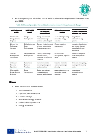BLUE PORTS | D2.5 Identification of present and future skills needs 117%uf0a7 Blue and green jobs that could be the most in demand in the port sector between now and 2030:Table 25. Blue and green jobs that could be the most in demand in the port sector in GeorgiaJob / Professional profile BLUE PORTS Area(s) Description of the role / job (tasks and responsibilities) Skills and competences required Port initiatives in terms of Green Transition that affect the job / position 1.RenewableEnergy SystemsEngineerEnergyManagementDesign and maintainrenewable energysystems within the portAdvanced engineering,renewable energyexpertiseIntegration ofrenewable energysystems2.Smart PortTechnologyManagerDigitalization andSmartTechnologiesOversee the deploymentof smart technologiesfor port managementIT, data analytics,cybersecurityIncreasing digitalizationand the use of smarttechnologies in portoperations3.WasteManagementCoordinatorIntegrated WasteManagementDevelop and managewaste reduction,recycling, and disposalprogramsEnvironmentalmanagement, logisticalskillsAdvanced integratedwaste managementsystems4.CircularEconomySpecialistSustainableBusinessPracticesImplement circulareconomy strategies inport operationsExpertise in circulareconomy, strategicplanningEmphasis on recycling,reusing, and reducingwaste5.RenewableEnergy SystemsEngineerEnergyManagementDesign and maintainrenewable energysystems within the portAdvanced engineering,renewable energyexpertiseIntegration ofrenewable energysystemsGreece %uf0a7 Main job needs in 2030 foreseen:1. Alternative fuels.2. Digitalization/automation.3. Climate change4. Renewable energy sources.5. Environmental protection.6. Energy transition.