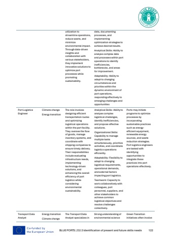 BLUE PORTS | D2.5 Identification of present and future skills needs 122utilization tostreamline operations,reduce waste, andminimizeenvironmental impact.Through data-driveninsights andcollaboration withvarious stakeholders,they implementinnovative solutions tooptimize portprocesses whilepromotingsustainability.data, documentingprocesses, andimplementingoptimization strategies toachieve desired results.Analytical Skills: Ability toanalyse complex dataand processes within portoperations to identifyinefficiencies,bottlenecks, and areasfor improvement.Adaptability: Ability toadapt to changingcircumstances andpriorities within thedynamic environment ofport operations,responding effectively toemerging challenges andopportunitiesPort LogisticsEngineerClimate changeEnergy transitionThe role involvesdesigning efficienttransportation routesand optimizinglogistical operationswithin the port facility.They oversee the flowof goods, manageinventory systems, andcoordinate withshipping companies toensure timely delivery.Their responsibilitiesinclude evaluatinginfrastructure needs,implementingtechnology-drivensolutions, andenhancing the overallefficiency of portlogistics whileconsideringenvironmentalsustainability.Analytical Skills: Ability toanalyse complexlogistical challenges,identify inefficiencies,and propose effectivesolutions.Organizational Skills:Capability to managemultiple taskssimultaneously, prioritizeactivities, and coordinatelogistics operationsefficiently.Adaptability: Flexibility toadapt to changinglogistical requirements,operational demands,and external factorsimpacting port logistics.Teamwork: Capacity towork collaboratively withcolleagues, portpersonnel, suppliers, andother stakeholders toachieve commonlogistical objectives andresolve challengescollectively.Ports may initiateprograms to optimizeprocesses byincorporatingsustainable practicessuch as energyefficient equipment,renewable energysources, and wastereduction strategies.Port logistics engineersare tasked withidentifyingopportunities tointegrate thesepractices into portoperations effectively.Transport DataAnalystEnergy transitionClimate changeThe Transport DataAnalyst specializes inStrong understanding ofenvironmental scienceGreen Transitioninitiatives often involve