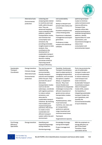 BLUE PORTS | D2.5 Identification of present and future skills needs 123Alternative fuelsEnvironmentalprotectioncollecting andanalysing data relatedto maritime and roadtraffic within the portarea. They useadvanced analyticaltools to identify trafficpatterns, optimizetransportation routes,and minimize fuelconsumption andemissions. Byproviding actionableinsights based on dataanalysis, theycontribute to thedevelopment ofsustainable transportstrategies and supportdecision-makingprocesses aimed atimproving overalltransport efficiency.and sustainabilitymetrics.Ability to interpret andpresent data clearly andconcisely.Excellent analytical andcritical thinking skills.Experience in databasemanagement and reportgeneration.Proficiency in dataanalysis and statisticalsoftware.optimizing transportroutes to minimizecarbon emissions andimprove efficiency.Transport DataAnalysts utilize dataanalysis techniques toevaluate transportationpatterns, identifyopportunities for routeoptimization, andrecommend changes toreduce fuelconsumption andenvironmental impact.SustainableTransportCoordinatorEnergy transitionClimate changeAlternative fuelsEnvironmentalprotectionThe role focuses onimplementingenvironmentallyfriendly transportpolicies and strategieswithin the port. Theypromote the use ofalternativetransportation modessuch as rail andwaterways, coordinatewith logistics partnersto reduce carbonemissions, andadvocate forsustainable transportinitiatives. By fosteringintermodality andimplementing bestpractices, they striveto create a moresustainable andefficient transportsystem within the portenvironment.Flexibility: MultimodalTransport Coordinatorsneed to adapt quickly tochanging transportationconditions, such as routedisruptions, weatherdelays, or equipmentfailures. They mustremain flexible andresponsive to unexpectedchallenges to ensure theefficient movement ofgoods across varioustransportation modes.Integration Multidisciplinary skills:must harmonizemaritime, rail, road, andair transportationsystems to optimizecargo movement andminimize transit timesTeamwork Organizational capacityPorts may promote theuse of sustainabletransport modes suchas rail and waterwaysto reduce reliance onroad transport andlower emissions.Sustainable TransportCoordinators analysedata on transportmodal shifts, assessthe feasibility ofintegrating sustainabletransport modes intoport operations, andquantify theenvironmental benefitsof such initiatives.Port EnergyEfficiencySpecialistsEnergy transition Identifying andimplementing energysaving measures.Monitoring energyKnowledge of energysaving technologies.Project managementskills.With the emphasis onenergy efficiency aspart of the GreenTransition, thesespecialists will be