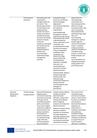 BLUE PORTS | D2.5 Identification of present and future skills needs 125Environmentalprotectionalternative fuels, andsustainabilitystrategies within theport sector. Theyidentify opportunitiesfor optimisation anddevelop tailoredsolutions to reduceenergy consumptionand greenhouse gasemissions. By stayingabreast of industrytrends andregulations, they guideport authorities andstakeholders inimplementing costeffective andenvironmentallyresponsible energymanagementpractices.sustainable energypractices, and developtailored strategiesaligning withenvironmental objectivesand regulatoryrequirements.Client RelationshipManagement: Ability tobuild and maintain strongrelationships with clients,understanding theirneeds, expectations, andconstraints, andproviding tailored energysolutions and support.Project management:Capability to plan,coordinate, andimplement energyprojects effectively,including settingobjectives, managingresources, andoverseeing projectexecution to achievedesired outcomes.Analytical Skills: Ability toanalyse energy data,identify trends, andevaluate energyconsumption patterns todevelop informedrecommendations andstrategies foroptimization.opportunities forreducing energyconsumption andimproving operationalefficiency. EnergyConsultants play a vitalrole in conductingthese assessments,analysing energy usagedata, andrecommendingstrategies to optimizeenergy usage andreduce environmentalimpact. In addition,energy consultantsassess the feasibility ofrenewable energyprojects, conduct costbenefit analyses, andproviderecommendations forintegrating renewableenergy systems intoport infrastructure.ElectricalMaintenanceEngineersClimate changeEnergy transitionElectrical MaintenanceEngineers play acrucial role in ensuringthe proper functioningof the grid and theelectrified equipmentwithin port facilities.They conduct regularinspections, diagnoseelectrical faults, andperform preventivemaintenance tominimize downtimeand optimize energyusage. With theirtechnical expertise,they contribute toProblem solving: Ability toidentify and resolveelectrical issuesefficiently, using criticalthinking and analyticalskills to diagnoseproblems and implementeffective solutions.Attention to Detail: Strongattention to detail isessential for conductingthorough inspections,ensuring compliance withsafety standards, andaccurately documentingmaintenance activities.Ports may invest inrenewable energysources such as solarpanels or wind turbinesto power port facilitiesand equipment.Electrical MaintenanceEngineers areresponsible forinstalling, maintaining,and optimizingrenewable energysystems, ensuring theirreliability and efficiencyto support the port'sGreen Transitionobjectives. In addition,