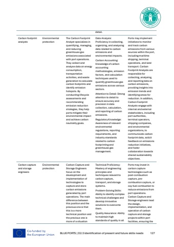 BLUE PORTS | D2.5 Identification of present and future skills needs 127detail.Carbon footprintanalystsEnvironmentalprotectionThe Carbon FootprintAnalyst specializes inquantifying, managing,and reducinggreenhouse gasemissions associatedwith port operations.They collect andanalyse data on energyconsumption,transportationactivities, and wastegeneration to calculatecarbon footprints andidentify emissionhotspots. Byconducting lifecycleassessments andrecommendingemission reductionstrategies, they helpports mitigate theirenvironmental impactand achieve carbonneutrality goals.Data Analysis:Proficiency in collecting,organizing, and analysingdata related to carbonemissions andenvironmental impacts.Carbon Accounting:Knowledge of carbonaccountingmethodologies, emissionfactors, and calculationtechniques used toquantify greenhouse gasemissions across varioussectors.Attention to Detail: Strongattention to detail toensure accuracy andprecision in datacollection, calculation,and reporting of carbonemissions.Regulatory Knowledge:Awareness of relevantenvironmentalregulations, reportingrequirements, andindustry standardsrelated to carbonfootprinting andgreenhouse gasmanagement.Ports may implementinitiatives to monitorand track carbonemissions from varioussources within the port,including maritimeshipping, terminaloperations, and landtransport. CarbonFootprint Analysts areresponsible forcollecting, analysing,and reporting data oncarbon emissions,providing insights intoemission trends andidentifying areas forreduction. In addition,Carbon FootprintAnalysts engage withinternal and externalstakeholders, includingport authorities,terminal operators,shipping companies,and environmentalorganizations, tocommunicate carbonfootprint data, solicitfeedback on emissionsreduction initiatives,and fostercollaboration towardsshared sustainabilityobjectives.Carbon captureand storageengineersEnvironmentalprotectionCarbon Capture andStorage Engineersfocus on thedevelopment andimplementation oftechnologies tocapture and storecarbon emissionsgenerated by portoperations. The maindifference betweenthis position and theprevious one is thatthis is a moretechnical position andthe previous one ismore of a situationTechnical Proficiency:Mastery of engineeringprinciples andtechniques relevant tocarbon capture,transport, and storagesystems.Problem-Solving Skills:Ability to identify complextechnical challenges anddevelop innovativesolutions to overcomethem.Quality Assurance: Abilityto maintain highstandards of quality in allPorts may invest incarbon capturetechnologies such aspost-combustioncapture, precombustion capture, oroxy-fuel combustion toreduce emissions fromport operations.Carbon Capture andStorage engineers leadthe design,implementation, andoperation of carboncapture and storageprojects within portfacilities, ensuring the