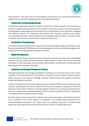 BLUE PORTS | D2.5 Identification of present and future skills needs 13best practices. The rapid pace of technological advancement and evolving environmental regulations necessitates ongoing education and skill development.%u2022 Collaboration and Knowledge Sharing: Facilitating collaboration between academic institutions, industry experts, and international bodies throughout the development of the scheme, focusing on research and development in emerging green technologies and best practices for sustainability in port operations. Engaging with external experts and institutions will enhance the scheme's relevance and quality, ensuring alignment with industry trends and technological advancements. It will also foster innovation and continuous improvement in green port practices.%u2022 Prioritization of Training Areas: The report identifies priority areas to help tailor the training methodology and training content. By prioritizing the BLUE PORTS areas, the training program can be more effectively aligned with specific skills and competencies required in the field .%u2022 Digital-First Approach: The BLUE PORTS scheme needs to be built on circular economy principles, with a fully-digital material and zero-waste processes involved. Digital approach aligns with circular economy principles by reducing waste and promoting sustainability, ensuring that training practices themselves reflect the green transition.%u2022 Leadership and Strategic Management Training Although leadership and strategic management training is not a primary focus of the current scheme, it is recommended for future projects. Emphasis could be drawn on green finance, policy advocacy, and long-term strategic planning. Effective leadership appears critical for advancing the green transition.As the port industry moves towards a greener future, the BLUE PORTS scheme stands as a vital initiative, ensuring that the human capital within the port ecosystem is prepared to meet the demands of the Green Transition. Through targeted investment in training and development, ports can achieve their sustainability goals, secure economic growth, and play a leading role in the global effort to combat climate change.By 2030, the port sector will need to embrace advanced technologies, sustainable practices, and a workforce that is both skilled and adaptable. The training needs assessment and recommendations provided in this report serve as a guiding framework to achieve these objectives, ensuring that ports are well-positioned to thrive in a sustainable future.