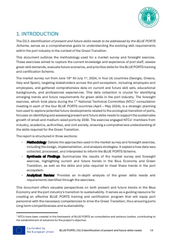 BLUE PORTS | D2.5 Identification of present and future skills needs 141. INTRODUCTIONThe D2.5 Identification of present and future skills needs to be addressed by the BLUE PORTS Scheme, serves as a comprehensive guide to understanding the evolving skill requirements within the port industry in the context of the Green Transition. This document outlines the methodology used for a market survey and foresight exercise. These exercises aimed to capture the current knowledge and experience of port staff, assess green skill demands, evaluate future scenarios, and prioritize skills for the BLUE PORTS training and certification Scheme.The market survey run from June 19th till July 1st, 2024, in four (4) countries (Georgia, Greece, Italy and Spain), targeting stakeholders across the port ecosystem, including employers andemployees, and gathered comprehensive data on current and future skill sets, educational backgrounds, and professional experiences. This data collection is crucial for identifying emerging trends and future requirements for green skills in the port industry. The foresight exercise, which took place during the 1st National Technical Committee (NTC)1 consultation meeting in each of the four BLUE PORTS countries (April %u2013 May 2024), is a strategic planning tool used to explore potential future developments related to the ecological transition of ports, focuses on identifying and assessing present and future skills needs to support the sustainable growth of small and medium-sized ports by 2030. The exercise engaged NTCs%u2019 members from industry, academia, authorities, and civil society, ensuring a comprehensive understanding of the skills required for the Green Transition.The report is structured in three sections: %uf0a7 Methodology: Details the approaches used in the market survey and foresight exercise, including the design, implementation, and analysis strategies. It explains how data was collected, processed, and interpreted to inform the BLUE PORTS Scheme.%uf0a7 Synthesis of Findings: Summarizes the results of the market survey and foresight exercise, highlighting current and future trends in the Blue Economy and Green Transition, as well as the skills and jobs required to meet these trends in the port ecosystem.%uf0a7 Analytical Revie Provides an in-depth analysis of the green skills needs and requirements identified through the exercises. This document offers valuable perspectives on both present and future trends in the Blue Economy and the port industry's transition to sustainability. It serves as a guiding resource for creating an effective BLUE PORTS training and certification program that will equip port personnel with the necessary competencies to drive the Green Transition, thus ensuring ports long-term competitiveness and sustainability. 1 NTCs have been created in the framework of BLUE PORTS as consultative and advisory bodies, contributing to the establishment of solutions for the project's objective.