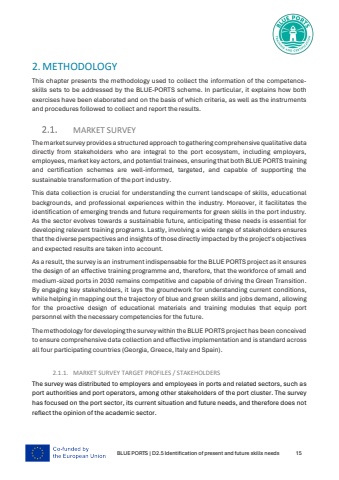 BLUE PORTS | D2.5 Identification of present and future skills needs 152. METHODOLOGYThis chapter presents the methodology used to collect the information of the competenceskills sets to be addressed by the BLUE-PORTS scheme. In particular, it explains how both exercises have been elaborated and on the basis of which criteria, as well as the instruments and procedures followed to collect and report the results.MARKET SURVEYThe market survey provides a structured approach to gathering comprehensive qualitative data directly from stakeholders who are integral to the port ecosystem, including employers, employees, market key actors, and potential trainees, ensuring that both BLUE PORTS training and certification schemes are well-informed, targeted, and capable of supporting the sustainable transformation of the port industry.This data collection is crucial for understanding the current landscape of skills, educational backgrounds, and professional experiences within the industry. Moreover, it facilitates the identification of emerging trends and future requirements for green skills in the port industry. As the sector evolves towards a sustainable future, anticipating these needs is essential for developing relevant training programs. Lastly, involving a wide range of stakeholders ensures that the diverse perspectives and insights of those directly impacted by the project's objectives and expected results are taken into account. As a result, the survey is an instrument indispensable for the BLUE PORTS project as it ensures the design of an effective training programme and, therefore, that the workforce of small and medium-sized ports in 2030 remains competitive and capable of driving the Green Transition. By engaging key stakeholders, it lays the groundwork for understanding current conditions, while helping in mapping out the trajectory of blue and green skills and jobs demand, allowing for the proactive design of educational materials and training modules that equip port personnel with the necessary competencies for the future.The methodology for developing the survey within the BLUE PORTS project has been conceived to ensure comprehensive data collection and effective implementation and is standard across all four participating countries (Georgia, Greece, Italy and Spain). 2.1.1. MARKET SURVEY TARGET PROFILES / STAKEHOLDERSThe survey was distributed to employers and employees in ports and related sectors, such asport authorities and port operators, among other stakeholders of the port cluster. The survey has focused on the port sector, its current situation and future needs, and therefore does not reflect the opinion of the academic sector.