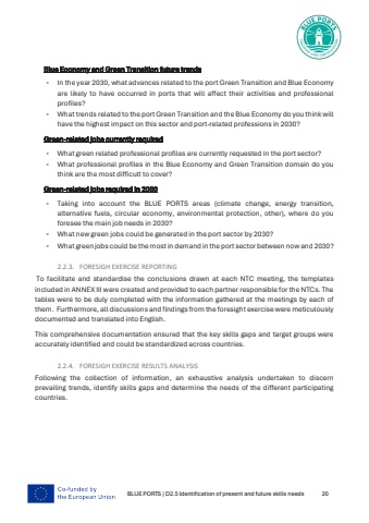 BLUE PORTS | D2.5 Identification of present and future skills needs 20Blue Economy and Green Transition future trends %uf0a7 In the year 2030, what advances related to the port Green Transition and Blue Economyare likely to have occurred in ports that will affect their activities and professional profiles? %uf0a7 What trends related to the port Green Transition and the Blue Economy do you think will have the highest impact on this sector and port-related professions in 2030? Green-related jobs currently required %uf0a7 What green related professional profiles are currently requested in the port sector? %uf0a7 What professional profiles in the Blue Economy and Green Transition domain do you think are the most difficult to cover? Green-related jobs required in 2030 %uf0a7 Taking into account the BLUE PORTS areas (climate change, energy transition, alternative fuels, circular economy, environmental protection, other), where do you foresee the main job needs in 2030? %uf0a7 What new green jobs could be generated in the port sector by 2030? %uf0a7 What green jobs could be the most in demand in the port sector between now and 2030?2.2.3. FORESIGH EXERCISE REPORTINGTo facilitate and standardise the conclusions drawn at each NTC meeting, the templates included in ANNEX III were created and provided to each partner responsible for the NTCs. The tables were to be duly completed with the information gathered at the meetings by each of them. Furthermore, all discussions and findings from the foresight exercise were meticulously documented and translated into English.This comprehensive documentation ensured that the key skills gaps and target groups were accurately identified and could be standardized across countries. 2.2.4. FORESIGH EXERCISE RESULTS ANALYSISFollowing the collection of information, an exhaustive analysis undertaken to discern prevailing trends, identify skills gaps and determine the needs of the different participating countries.