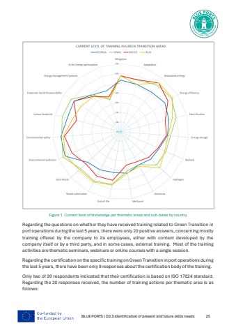 BLUE PORTS | D2.5 Identification of present and future skills needs 25Figure 1. Current level of knowledge per thematic areas and sub-areas by countryRegarding the questions on whether they have received training related to Green Transition in port operations during the last 5 years, there were only 20 positive answers, concerning mostly training offered by the company to its employees, either with content developed by the company itself or by a third party, and in some cases, external training. Most of the training activities are thematic seminars, webinars or online courses with a single session.Regarding the certification on the specific training on Green Transition in port operations during the last 5 years, there have been only 9 responses about the certification body of the training. Only two of 20 respondents indicated that their certification is based on ISO 17024 standard.Regarding the 20 responses received, the number of training actions per thematic area is as follows: