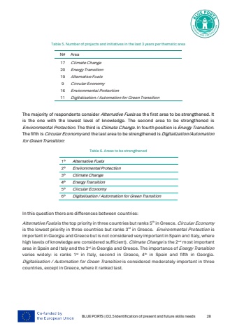 BLUE PORTS | D2.5 Identification of present and future skills needs 28Table 5. Number of projects and initiatives in the last 3 years per thematic areaN# Area17 Climate Change20 Energy Transition19 Alternative Fuels9 Circular Economy 16 Environmental Protection 11 Digitalisation / Automation for Green TransitionThe majority of respondents consider Alternative Fuels as the first area to be strengthened. It is the one with the lowest level of knowledge. The second area to be strengthened is Environmental Protection. The third is Climate Change. In fourth position is Energy Transition. The fifth is Circular Economy and the last area to be strengthened is Digitalization/Automation for Green Transition:Table 6. Areas to be strengthened1%u00ba Alternative Fuels2%u00ba Environmental Protection 3%u00ba Climate Change4%u00ba Energy Transition5%u00ba Circular Economy 6%u00ba Digitalisation / Automation for Green TransitionIn this question there are differences between countries:Alternative Fuels is the top priority in three countries but ranks 5th in Greece.Circular Economyis the lowest priority in three countries but ranks 3rd in Greece. Environmental Protection is important in Georgia and Greece but is not considered very important in Spain and Italy, wherehigh levels of knowledge are considered sufficient). Climate Change is the 2nd most important area in Spain and Italy and the 3rd in Georgia and Greece. The importance of Energy Transitionvaries widely: is ranks 1st in Italy, second in Greece, 4th in Spain and fifth in Georgia.Digitalisation / Automation for Green Transition is considered moderately important in three countries, except in Greece, where it ranked last.