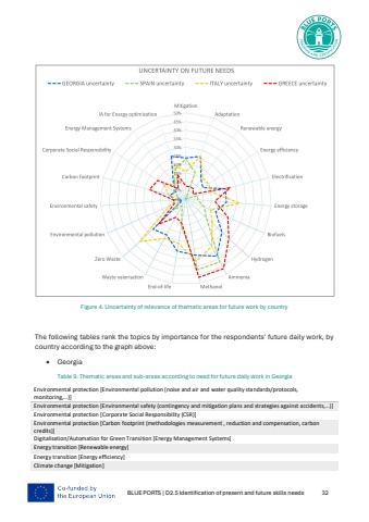BLUE PORTS | D2.5 Identification of present and future skills needs 32Figure 4. Uncertainty of relevance of thematic areas for future work by countryThe following tables rank the topics by importance for the respondents' future daily work, by country according to the graph above:%u2022 GeorgiaTable 9. Thematic areas and sub-areas according to need for future daily work in GeorgiaEnvironmental protection [Environmental pollution (noise and air and water quality standards/protocols, monitoring,%u2026)]Environmental protection [Environmental safety (contingency and mitigation plans and strategies against accidents,%u2026)]Environmental protection [Corporate Social Responsibility (CSR)]Environmental protection [Carbon footprint (methodologies measurement , reduction and compensation, carbon credits)]Digitalisation/Automation for Green Transition [Energy Management Systems]Energy transition [Renewable energy]Energy transition [Energy efficiency]Climate change [Mitigation]