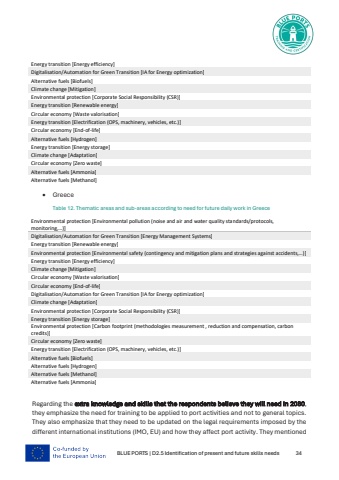 BLUE PORTS | D2.5 Identification of present and future skills needs 34Energy transition [Energy efficiency]Digitalisation/Automation for Green Transition [IA for Energy optimization]Alternative fuels [Biofuels]Climate change [Mitigation]Environmental protection [Corporate Social Responsibility (CSR)]Energy transition [Renewable energy]Circular economy [Waste valorisation]Energy transition [Electrification (OPS, machinery, vehicles, etc.)]Circular economy [End-of-life]Alternative fuels [Hydrogen]Energy transition [Energy storage]Climate change [Adaptation]Circular economy [Zero waste]Alternative fuels [Ammonia]Alternative fuels [Methanol]%u2022 GreeceTable 12. Thematic areas and sub-areas according to need for future daily work in GreeceEnvironmental protection [Environmental pollution (noise and air and water quality standards/protocols, monitoring,%u2026)]Digitalisation/Automation for Green Transition [Energy Management Systems]Energy transition [Renewable energy]Environmental protection [Environmental safety (contingency and mitigation plans and strategies against accidents,%u2026)]Energy transition [Energy efficiency]Climate change [Mitigation]Circular economy [Waste valorisation]Circular economy [End-of-life]Digitalisation/Automation for Green Transition [IA for Energy optimization]Climate change [Adaptation]Environmental protection [Corporate Social Responsibility (CSR)]Energy transition [Energy storage]Environmental protection [Carbon footprint (methodologies measurement , reduction and compensation, carbon credits)]Circular economy [Zero waste]Energy transition [Electrification (OPS, machinery, vehicles, etc.)]Alternative fuels [Biofuels]Alternative fuels [Hydrogen]Alternative fuels [Methanol]Alternative fuels [Ammonia]Regarding the extra knowledge and skills that the respondents believe they will need in 2030, they emphasize the need for training to be applied to port activities and not to general topics. They also emphasize that they need to be updated on the legal requirements imposed by the different international institutions (IMO, EU) and how they affect port activity. They mentioned