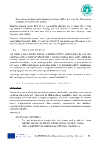 BLUE PORTS | D2.5 Identification of present and future skills needs 38%uf0a7 Roles related to Sustainable Development Goals (SDGs) and other Key Performance Indicators (KPIs) in the port context.Regarding training needs, 93% of the respondents estimate that at least 25% of their organization%u2019s workforce will need training, and it is relevant to mention that 32% of respondents estimate that more than 50% of their workforce will need training in Green Transition skills by 2030.One-third of respondents expect their organizations will hire 0-5 employees dedicated to sustainable initiatives by 2030. 15% estimate hiring 6-10 new employees, 15% expect to hire more than 10, and 10% foresee no new hires. The remaining 26% are unsure.FORESIGHT EXERCISEThis section includes the joint analysis results found in the foresight exercise by topic (Blue Economy and Green Transition future trends in small and medium ports; Green related-jobs currently required in small and medium ports; most difficult Green Transition-related professional profiles to recruit nowadays; green related-jobs that could be generated in the port sector in 2030; most required green related-jobs in the port sector in 2030; target groups of the scheme, i.e. which professions in the port ecosystem are priorities for acquiring and/or developing green and blue skills; training priority thematic areas).The analysis per topic and per country of the foresight exercise results, undertaken in the 1stNTC meeting in each of the four countries, is available in ANNEX IV.3.2.1. BLUE ECONOMY AND GREEN TRANSITION FUTURE TRENDSJoint analysis The maritime industry is rapidly transitioning towards sustainability to address environmental concerns and comply with regulations. By 2030, ports are expected to adopt zero-emission technologies, advanced waste management systems, and smart technologies to enhance efficiency and environmental monitoring. This shift will require a workforce skilled in renewable energy, environmental management, data analytics, cybersecurity, and regulatory compliance. Emphasis on circular economy practices will further promote recycling, reusing, and waste reduction.2030 Vision:%uf0a7 Zero-Emission Technologies:o Ports will widely adopt zero-emission technologies such as electric cranes, hydrogen-powered vehicles, and shore power (cold ironing) for vessels.o Requires expertise in renewable energy systems and maintenance.