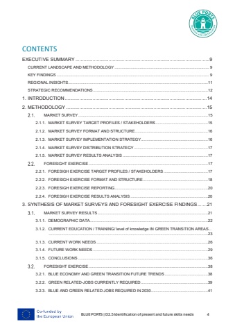 BLUE PORTS | D2.5 Identification of present and future skills needs 4CONTENTSEXECUTIVE SUMMARY .....................................................................................................9CURRENT LANDSCAPE AND METHODOLOGY ................................................................................... 9KEY FINDINGS ...................................................................................................................................... 9REGIONAL INSIGHTS...........................................................................................................................11STRATEGIC RECOMMENDATIONS.....................................................................................................121. INTRODUCTION...........................................................................................................142. METHODOLOGY ..........................................................................................................15MARKET SURVEY..................................................................................................................152.1.1. MARKET SURVEY TARGET PROFILES / STAKEHOLDERS..............................................152.1.2. MARKET SURVEY FORMAT AND STRUCTURE................................................................162.1.3. MARKET SURVEY IMPLEMENTATION STRATEGY...........................................................162.1.4. MARKET SURVEY DISTRIBUTION STRATEGY.................................................................172.1.5. MARKET SURVEY RESULTS ANALYSIS ...........................................................................17FORESIGHT EXERCISE.........................................................................................................172.2.1. FORESIGH EXERCISE TARGET PROFILES / STAKEHOLDERS.......................................172.2.2. FORESIGH EXERCISE FORMAT AND STRUCTURE.........................................................182.2.3. FORESIGH EXERCISE REPORTING..................................................................................202.2.4. FORESIGH EXERCISE RESULTS ANALYSIS ....................................................................203. SYNTHESIS OF MARKET SURVEYS AND FORESIGHT EXERCISE FINDINGS.......21MARKET SURVEY RESULTS.................................................................................................213.1.1. DEMOGRAPHIC DATA........................................................................................................223.1.2. CURRENT EDUCATION / TRAINING/ level of knowledge IN GREEN TRANSITION AREAS..............................................................................................................................................233.1.3. CURRENT WORK NEEDS ..................................................................................................263.1.4. FUTURE WORK NEEDS .....................................................................................................293.1.5. CONCLUSIONS ..................................................................................................................36FORESIGHT EXERCISE.........................................................................................................383.2.1. BLUE ECONOMY AND GREEN TRANSITION FUTURE TRENDS......................................383.2.2. GREEN RELATED-JOBS CURRENTLY REQUIRED...........................................................393.2.3. BLUE AND GREEN RELATED JOBS REQUIRED IN 2030..................................................41