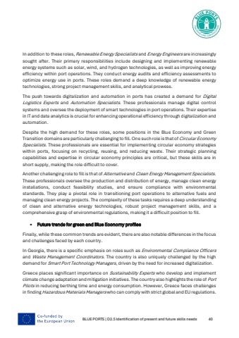 BLUE PORTS | D2.5 Identification of present and future skills needs 40In addition to these roles, Renewable Energy Specialists and Energy Engineers are increasingly sought after. Their primary responsibilities include designing and implementing renewable energy systems such as solar, wind, and hydrogen technologies, as well as improving energy efficiency within port operations. They conduct energy audits and efficiency assessments to optimize energy use in ports. These roles demand a deep knowledge of renewable energy technologies, strong project management skills, and analytical prowess.The push towards digitalization and automation in ports has created a demand for Digital Logistics Experts and Automation Specialists. These professionals manage digital control systems and oversee the deployment of smart technologies in port operations. Their expertise in IT and data analytics is crucial for enhancing operational efficiency through digitalization and automation.Despite the high demand for these roles, some positions in the Blue Economy and Green Transition domains are particularly challenging to fill. One such role is that of Circular Economy Specialists. These professionals are essential for implementing circular economy strategies within ports, focusing on recycling, reusing, and reducing waste. Their strategic planning capabilities and expertise in circular economy principles are critical, but these skills are in short supply, making the role difficult to cover.Another challenging role to fill is that of Alternative and Clean Energy Management Specialists. These professionals oversee the production and distribution of energy, manage clean energy installations, conduct feasibility studies, and ensure compliance with environmental standards. They play a pivotal role in transitioning port operations to alternative fuels and managing clean energy projects. The complexity of these tasks requires a deep understanding of clean and alternative energy technologies, robust project management skills, and a comprehensive grasp of environmental regulations, making it a difficult position to fill.%u2022 Future trends for green and Blue Economy profiles Finally, while these common trends are evident, there are also notable differences in the focus and challenges faced by each country.In Georgia, there is a specific emphasis on roles such as Environmental Compliance Officersand Waste Management Coordinators. The country is also uniquely challenged by the high demand for Smart Port Technology Managers, driven by the need for increased digitalization.Greece places significant importance on Sustainability Experts who develop and implement climate change adaptation and mitigation initiatives. The country also highlights the role of Port Pilots in reducing berthing time and energy consumption. However, Greece faces challenges in finding Hazardous Materials Managers who can comply with strict global and EU regulations.
