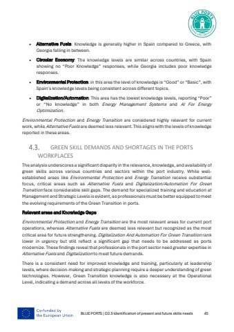BLUE PORTS | D2.5 Identification of present and future skills needs 45%u2022 Alternative Fuels: Knowledge is generally higher in Spain compared to Greece, with Georgia falling in between.%u2022 Circular Economy: The knowledge levels are similar across countries, with Spain showing no %u201cPoor Knowledge%u201d responses, while Georgia includes poor knowledge responses.%u2022 Environmental Protection: in this area the level of knowledge is %u201cGood%u201d or %u201cBasic%u201d, with Spain's knowledge levels being consistent across different topics.%u2022 Digitalization/Automation: This area has the lowest knowledge levels, reporting %u201cPoor%u201dor %u201cNo knowledge%u201d in both Energy Management Systems and AI For Energy Optimization.Environmental Protection and Energy Transition are considered highly relevant for current work, while Alternative Fuels are deemed less relevant. This aligns with the levels of knowledge reported in these areas.GREEN SKILL DEMANDS AND SHORTAGES IN THE PORTS WORKPLACESThe analysis underscores a significant disparity in the relevance, knowledge, and availability of green skills across various countries and sectors within the port industry. While wellestablished areas like Environmental Protection and Energy Transition receive substantial focus, critical areas such as Alternative Fuels and Digitalization/Automation For Green Transition face considerable skill gaps. The demand for specialized training and education at Management and Strategic Levels is evident, as professionals must be better equipped to meet the evolving requirements of the Green Transition in ports.Relevant areas and Knowledge Gaps Environmental Protection and Energy Transition are the most relevant areas for current port operations, whereas Alternative Fuels are deemed less relevant but recognized as the most critical area for future strengthening. Digitalization And Automation For Green Transition rank lower in urgency but still reflect a significant gap that needs to be addressed as ports modernize. These findings reveal that professionals in the port sector need greater expertise in Alternative Fuels and Digitalization to meet future demands.There is a consistent need for improved knowledge and training, particularly at leadership levels, where decision-making and strategic planning require a deeper understanding of green technologies. However, Green Transition knowledge is also necessary at the Operational Level, indicating a demand across all levels of the workforce.