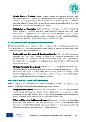 BLUE PORTS | D2.5 Identification of present and future skills needs 48%u2022 Circular Economy Practices: Waste reduction, reuse, and resource efficiency will become integral to port operations. Specialists in circular economy principles will be essential to develop strategies that minimize environmental impact and enhance resource efficiency. Ports will increasingly demand professionals skilled in waste valorisation, recycling, and sustainability planning.%u2022 Digitalization and Automation: Digital technologies will play a critical role in improving energy efficiency, reducing emissions, and optimizing logistics. Ports will need technicians and engineers skilled in automation, artificial intelligence (AI), and energy management systems. Small and medium-sized ports will particularly benefit from automation to improve competitiveness and streamline operations.Focus on Sustainability at Management and Strategic Levels The future green skills needs will extend beyond technical roles to strategic management. Small and medium ports will require leaders who are adept at integrating sustainability into business strategies. These leaders will need:%u2022 Sustainability and Environmental Compliance Expertise: With increasing regulatory pressure, ports will need compliance officers and managers knowledgeable in environmental law, corporate social responsibility (CSR), and sustainability frameworks. This ensures ports adhere to global and local standards while remaining economically viable.%u2022 Strategic Planning for Green Growth: Leaders will need to design and implement longterm sustainability strategies that align with business goals, considering the entire value chain from operations to stakeholders. Skills in energy transition planning, green finance, and policy advocacy will be critical as small and medium-sized ports seek to secure funding and develop innovative green projects.Adaptation to New Technologies and Energy Systems As technology evolves, small and medium ports will need to quickly adapt to emerging energy systems and digital tools. Anticipated green skills demands include:%u2022 Energy Efficiency Experts: Ports will need professionals to evaluate and implement energy-saving technologies, optimize energy usage, and reduce greenhouse gas emissions. Skills in data analytics, energy audits, and optimization technologies will be crucial for reducing operational costs and improving sustainability.%u2022 Hybrid and Alternative Fuel Systems Engineers: The growing importance of alternative fuels (hydrogen, ammonia, biofuels) will require ports to have engineers and technicians trained in the handling, storage, and distribution of these fuels, ensuring safety and compliance with strict environmental standards.