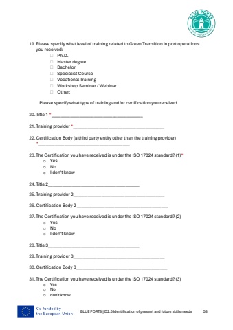 BLUE PORTS | D2.5 Identification of present and future skills needs 5819.Please specify what level of training related to Green Transition in port operations you received: Ph.D. Master degree Bachelor Specialist Course Vocational Training Workshop Seminar / Webinar Other:Please specify what type of training and/or certification you received.20. Title 1 *_______________________________________21. Training provider *_______________________________________22.Certification Body (a third party entity other than the training provider) *_______________________________________23. The Certification you have received is under the ISO 17024 standard? (1)* o Yeso Noo I don't know24. Title 2_______________________________________25. Training provider 2_______________________________________26.Certification Body 2 _______________________________________27. The Certification you have received is under the ISO 17024 standard? (2) o Yeso Noo I don't know28. Title 3_______________________________________29. Training provider 3_______________________________________30.Certification Body 3_______________________________________31. The Certification you have received is under the ISO 17024 standard? (3)o Yeso Noo don't know