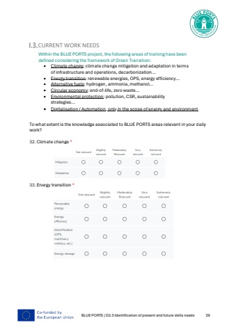 BLUE PORTS | D2.5 Identification of present and future skills needs 59CURRENT WORK NEEDSWithin the BLUE PORTS project, the following areas of training have been defined considering the framework of Green Transition:%u2022 Climate change: climate change mitigation and adaptation in terms of infrastructure and operations, decarbonization%u2026%u2022 Energy transition: renewable energies, OPS, energy efficiency%u2026%u2022 Alternative fuels: hydrogen, ammonia, methanol%u2026%u2022 Circular economy: end-of-life, zero waste%u2026%u2022 Environmental protection: pollution, CSR, sustainability strategies...%u2022 Digitalisation / Automation, only in the scope of energy and environmentTo what extent is the knowledge associated to BLUE PORTS areas relevant in your daily work? 32.Climate change *33.Energy transition *