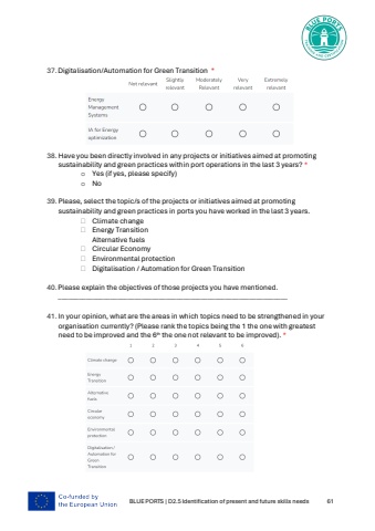BLUE PORTS | D2.5 Identification of present and future skills needs 6137.Digitalisation/Automation for Green Transition * 38.Have you been directly involved in any projects or initiatives aimed at promoting sustainability and green practices within port operations in the last 3 years? *o Yes (if yes, please specify)o No39.Please, select the topic/s of the projects or initiatives aimed at promoting sustainability and green practices in ports you have worked in the last 3 years. Climate change Energy Transition Alternative fuels Circular Economy Environmental protection Digitalisation / Automation for Green Transition40.Please explain the objectives of those projects you have mentioned.__________________________________________________________________41.In your opinion, what are the areas in which topics need to be strengthened in your organisation currently? (Please rank the topics being the 1 the one with greatest need to be improved and the 6th the one not relevant to be improved). *