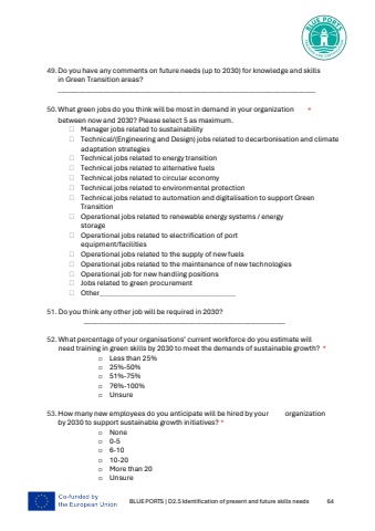 BLUE PORTS | D2.5 Identification of present and future skills needs 6449.Do you have any comments on future needs (up to 2030) for knowledge and skills in Green Transition areas?__________________________________________________________________________50.What green jobs do you think will be most in demand in your organization * between now and 2030? Please select 5 as maximum. Manager jobs related to sustainability Technical/(Engineering and Design) jobs related to decarbonisation and climate adaptation strategies Technical jobs related to energy transition Technical jobs related to alternative fuels Technical jobs related to circular economy Technical jobs related to environmental protection Technical jobs related to automation and digitalisation to support Green Transition Operational jobs related to renewable energy systems / energy storage Operational jobs related to electrification of port equipment/facilities Operational jobs related to the supply of new fuels Operational jobs related to the maintenance of new technologies Operational job for new handling positions Jobs related to green procurement Other51.Do you think any other job will be required in 2030?__________________________________________________________52.What percentage of your organisations%u2019 current workforce do you estimate will need training in green skills by 2030 to meet the demands of sustainable growth? *o Less than 25%o 25%-50%o 51%-75%o 76%-100% o Unsure53.How many new employees do you anticipate will be hired by your organization by 2030 to support sustainable growth initiatives? *o Noneo 0-5o 6-10o 10-20o More than 20o Unsure