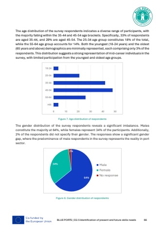 BLUE PORTS | D2.5 Identification of present and future skills needs 66The age distribution of the survey respondents indicates a diverse range of participants, with the majority falling within the 35-44 and 45-54 age brackets. Specifically, 33% of respondents are aged 35-44, and 29% are aged 45-54. The 25-34 age group constitutes 18% of the total, while the 55-64 age group accounts for 14%. Both the youngest (18-24 years) and the oldest (65 years and above) demographics are minimally represented, each comprising only 3% of the respondents. This distribution suggests a strong representation of mid-career individuals in the survey, with limited participation from the youngest and oldest age groups.Figure 7. Age distribution of respondentsThe gender distribution of the survey respondents reveals a significant imbalance. Males constitute the majority at 64%, while females represent 34% of the participants. Additionally, 2% of the respondents did not specify their gender. The responses show a significant gender gap, where the predominance of male respondents in the survey represents the reality in port sector. Figure 8. Gender distribution of respondents
