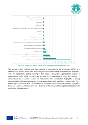 BLUE PORTS | D2.5 Identification of present and future skills needs 68Figure 10. Distribution of main activity of the companies where respondents workThe survey results indicate that the majority of respondents, 82 individuals (57%), are employed by private companies. Public organizations are the next most common employer, with 46 respondents (32%) working in this sector. Non-profit organizations employ 8 respondents (6%), while cooperatives account for 6 respondents (4%). Additionally, 3 respondents are business owners or freelancers. This distribution highlights a strong representation of the private sector among respondents, with significant participation from public organizations as well. The presence of non-profit and cooperative workers, along with business owners and freelancers, adds diversity to the survey, reflecting a broad spectrum of professional backgrounds.