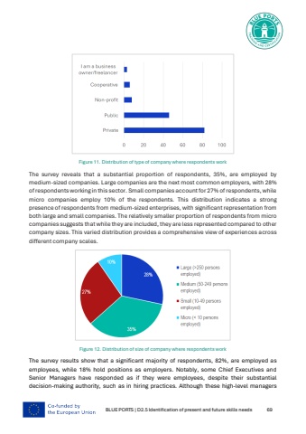 BLUE PORTS | D2.5 Identification of present and future skills needs 69Figure 11. Distribution of type of company where respondents workThe survey reveals that a substantial proportion of respondents, 35%, are employed by medium-sized companies. Large companies are the next most common employers, with 28% of respondents working in this sector. Small companies account for 27% of respondents, while micro companies employ 10% of the respondents. This distribution indicates a strong presence of respondents from medium-sized enterprises, with significant representation from both large and small companies. The relatively smaller proportion of respondents from micro companies suggests that while they are included, they are less represented compared to other company sizes. This varied distribution provides a comprehensive view of experiences across different company scales.Figure 12. Distribution of size of company where respondents workThe survey results show that a significant majority of respondents, 82%, are employed as employees, while 18% hold positions as employers. Notably, some Chief Executives and Senior Managers have responded as if they were employees, despite their substantial decision-making authority, such as in hiring practices. Although these high-level managers