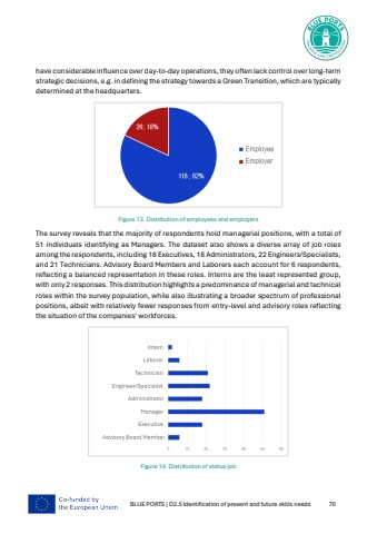 BLUE PORTS | D2.5 Identification of present and future skills needs 70have considerable influence over day-to-day operations, they often lack control over long-term strategic decisions, e.g. in defining the strategy towards a Green Transition, which are typically determined at the headquarters.Figure 13. Distribution of employees and employers The survey reveals that the majority of respondents hold managerial positions, with a total of 51 individuals identifying as Managers. The dataset also shows a diverse array of job roles among the respondents, including 18 Executives, 18 Administrators, 22 Engineers/Specialists, and 21 Technicians. Advisory Board Members and Laborers each account for 6 respondents, reflecting a balanced representation in these roles. Interns are the least represented group, with only 2 responses. This distribution highlights a predominance of managerial and technical roles within the survey population, while also illustrating a broader spectrum of professional positions, albeit with relatively fewer responses from entry-level and advisory roles reflecting the situation of the companies' workforces.Figure 14. Distribution of status job