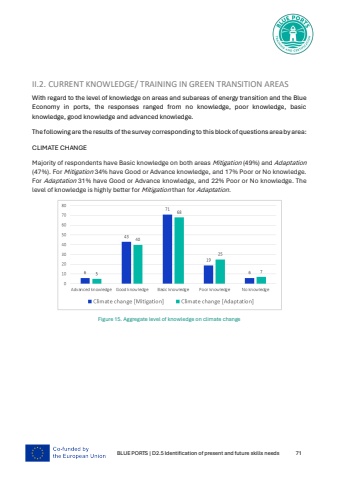 BLUE PORTS | D2.5 Identification of present and future skills needs 71II.2. CURRENT KNOWLEDGE/ TRAINING IN GREEN TRANSITION AREASWith regard to the level of knowledge on areas and subareas of energy transition and the Blue Economy in ports, the responses ranged from no knowledge, poor knowledge, basic knowledge, good knowledge and advanced knowledge.The following are the results of the survey corresponding to this block of questions area by area:CLIMATE CHANGEMajority of respondents have Basic knowledge on both areas Mitigation (49%) and Adaptation (47%). For Mitigation 34% have Good or Advance knowledge, and 17% Poor or No knowledge. For Adaptation 31% have Good or Advance knowledge, and 22% Poor or No knowledge. The level of knowledge is highly better for Mitigation than for Adaptation.Figure 15. Aggregate level of knowledge on climate change